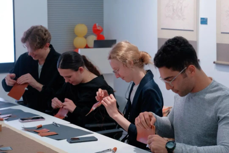 活动伊始,专业老师结合图文史料,生动讲解了皮具的起源演变、传统工艺传承及核心材料特性,从用料的挑选到缝线技巧的门道,让留学生们对这门古老手艺有了系统认知。