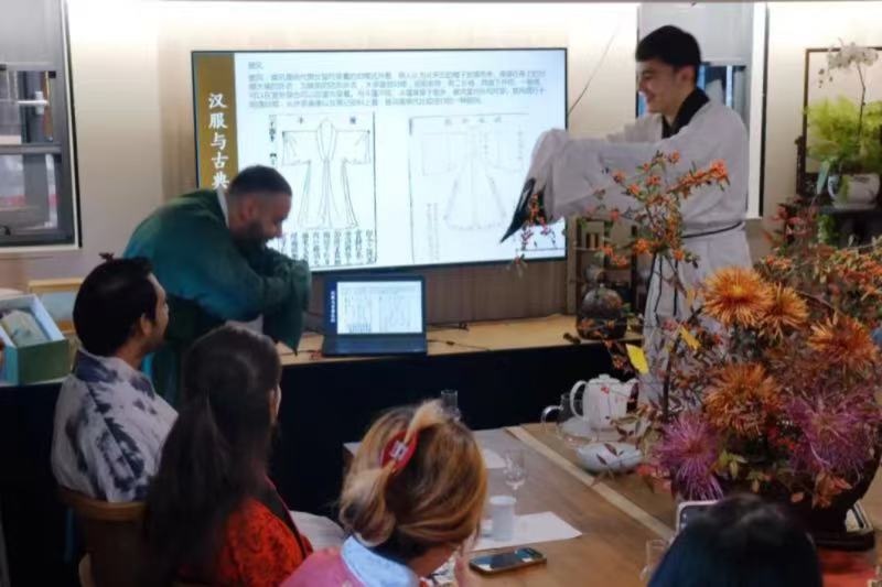 讲师以详实的史料为引,娓娓道来唐宋明文人 “品茗赏景、诗酒相伴” 的雅致生活,深入解读各朝代华服的形制演变、纹样寓意与时代文化内涵,让留学生们沉浸式感受传统服饰与生活美学的深厚底蕴。